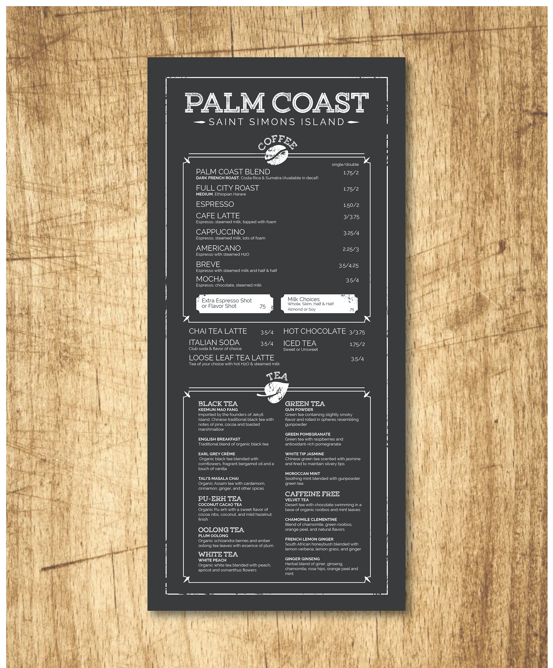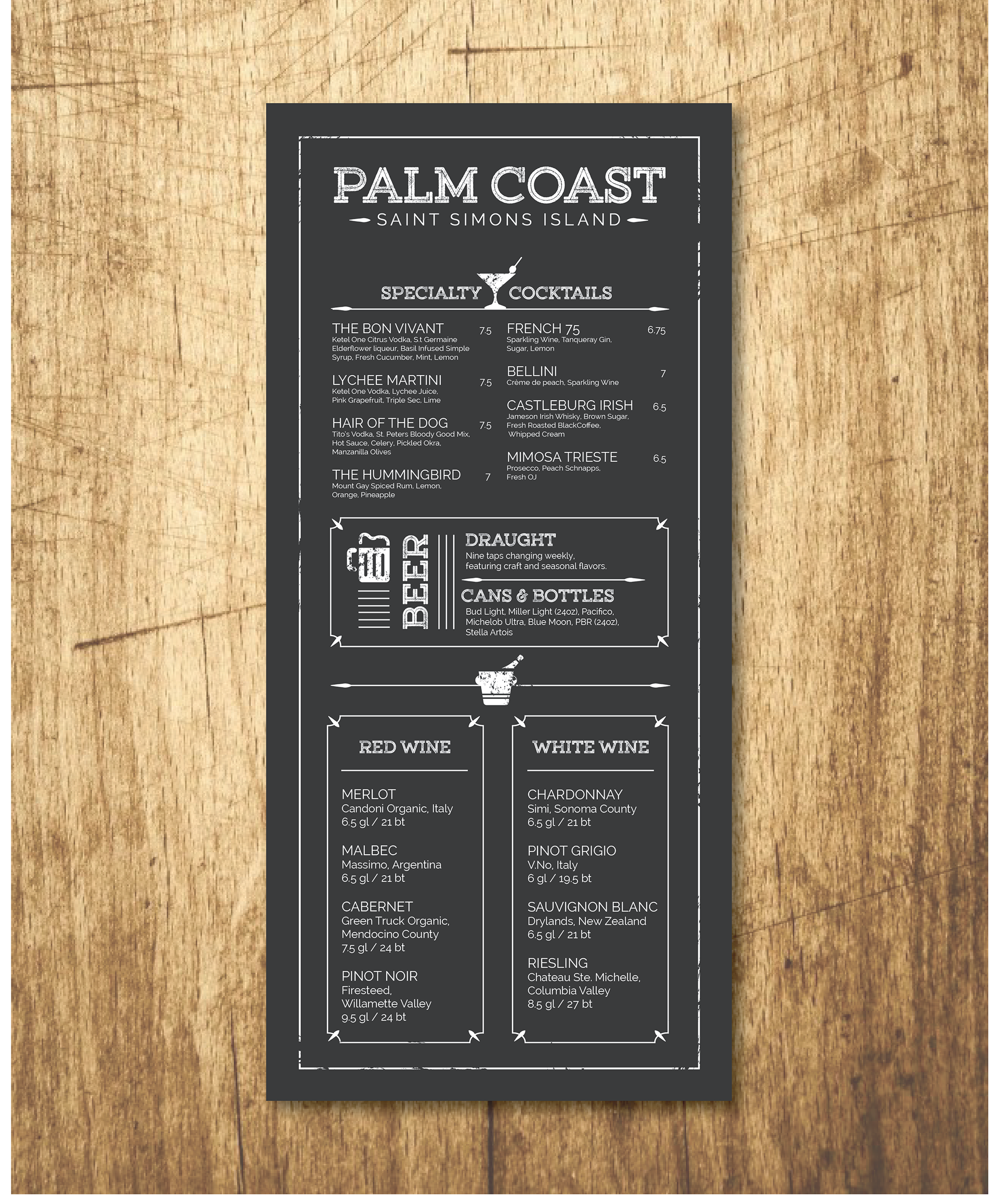 Logo and menu design for Palm Coast restaurant in Saint Simons Island, GA.