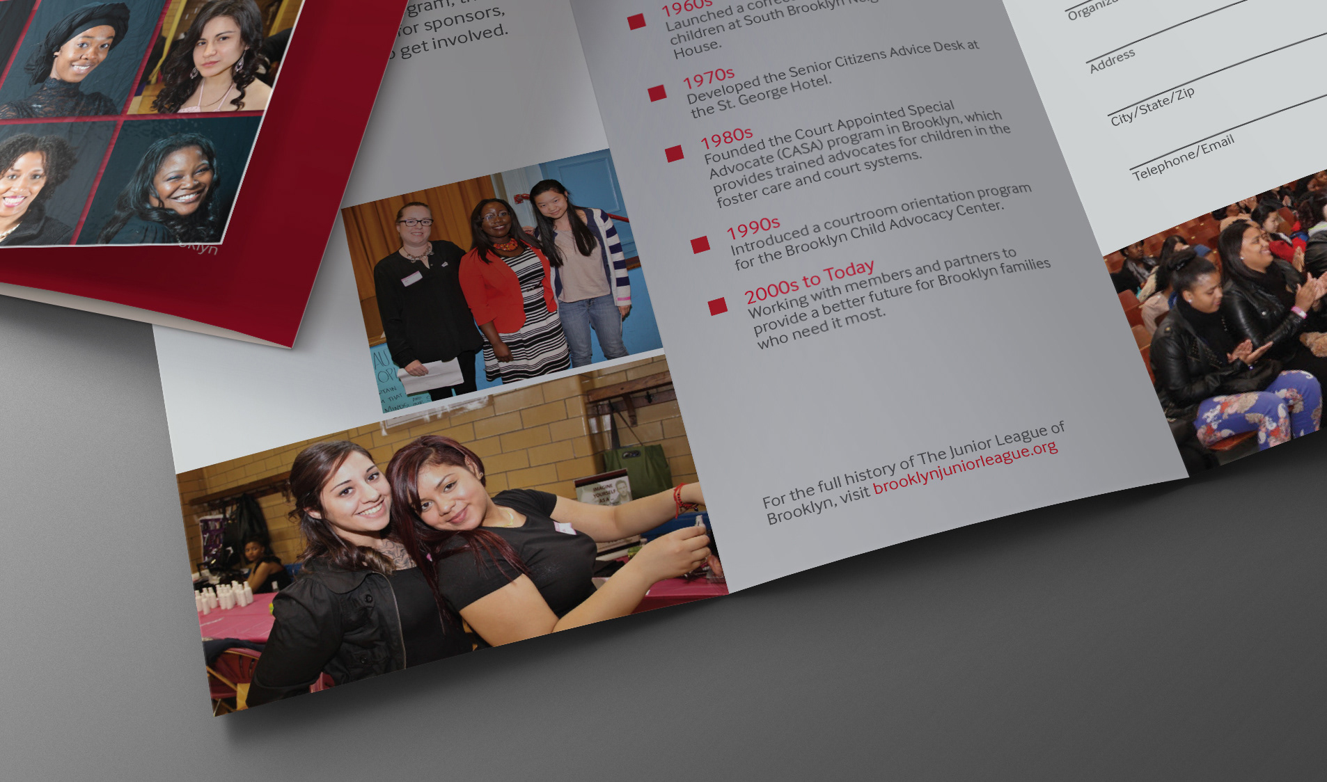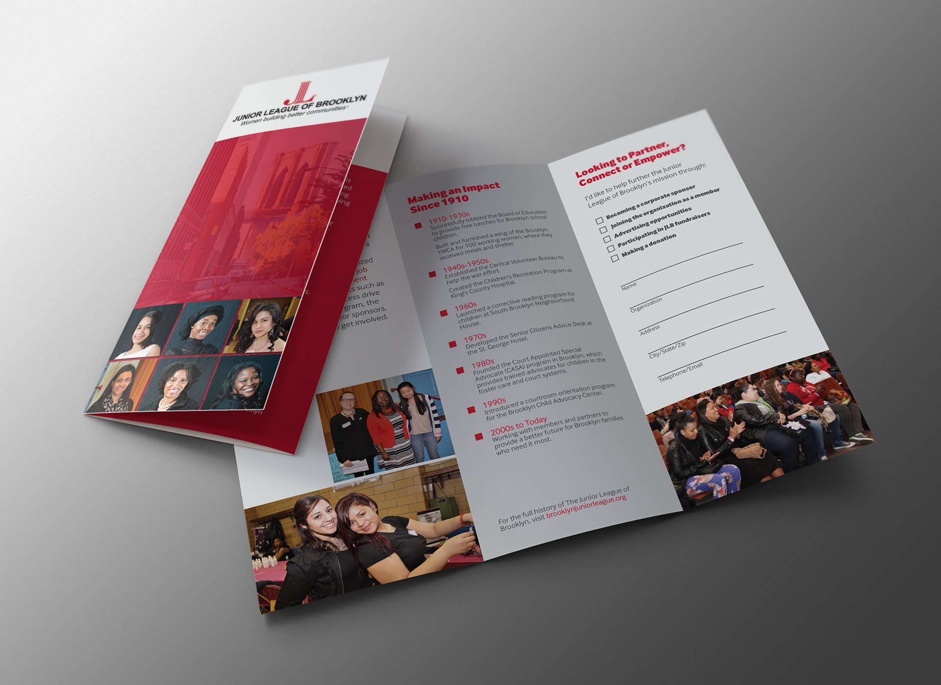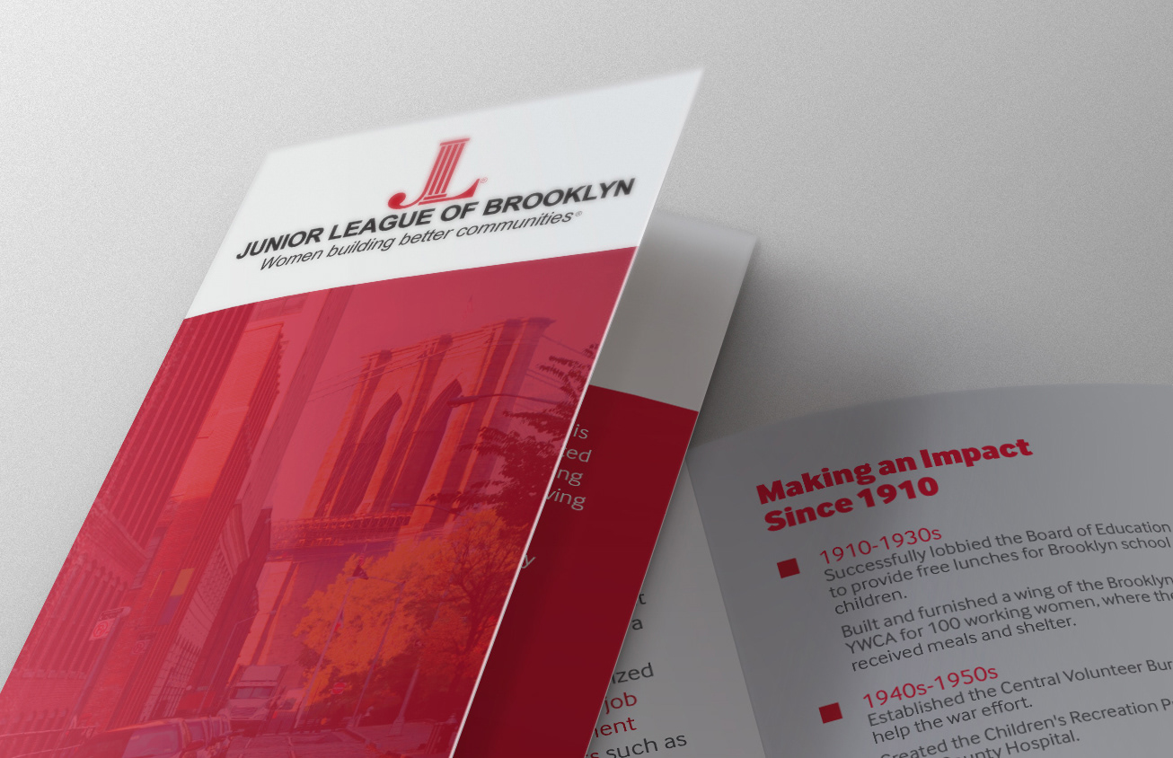 Tri-fold brochure design for the Junior League of Brooklyn.